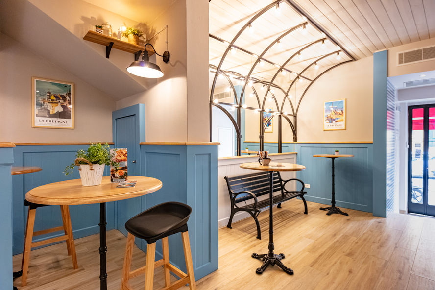 L’ambientazione del locale rimanda a immagini della Bretagna. Colori degli arredi e dei rivestimenti tradizionali e boiserie in legno creano un’ atmosfera accogliente e allegra.